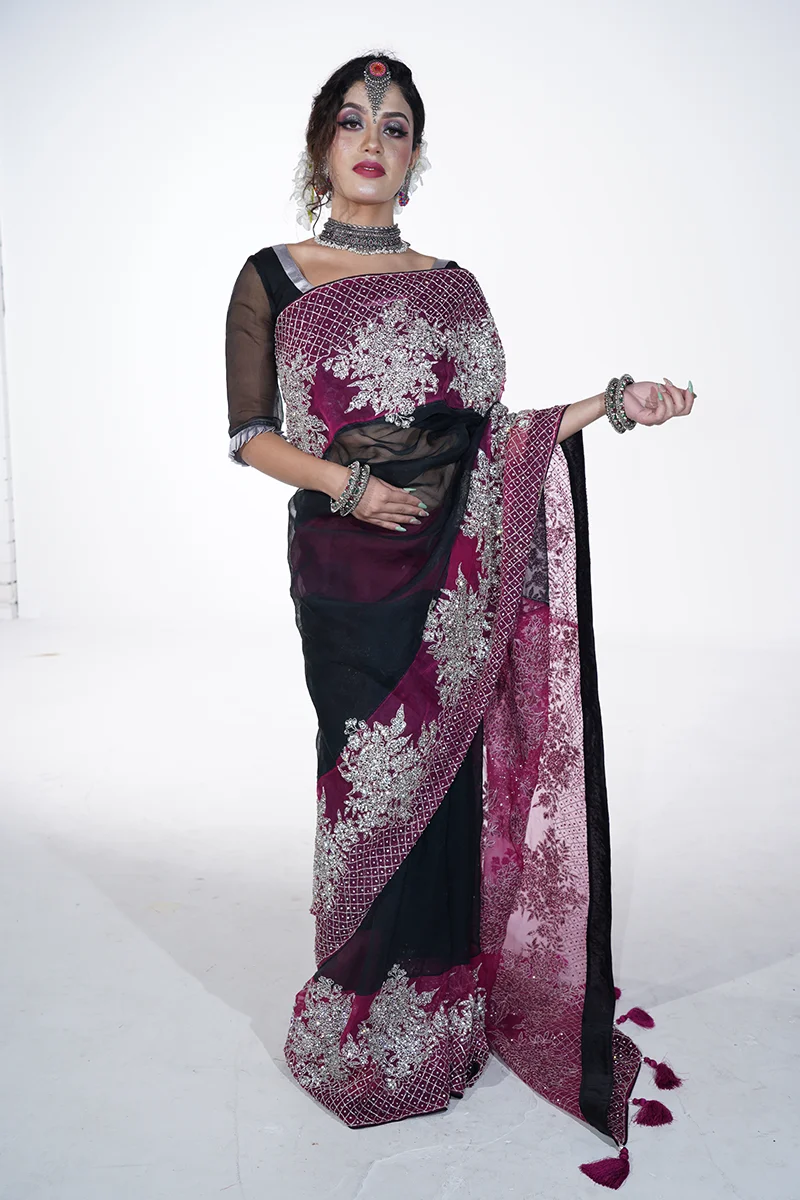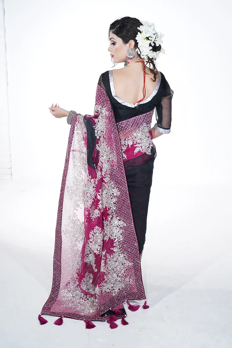Exquisite Black with hot pink original muslin saree, beautifully adorned with all over stone work, karchupi and enhanced with delicate tassel detailing. A perfect choice for wedding, parties, and festive celebrations.