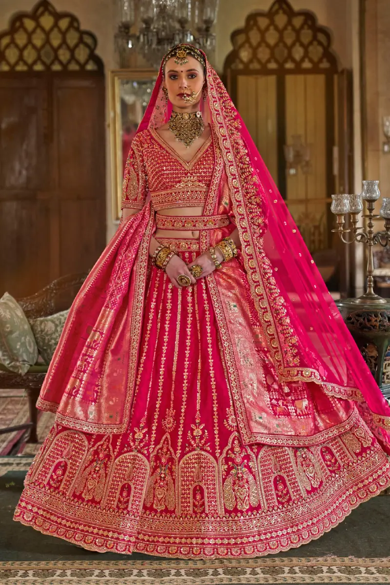 Gorgeous hot pink/rani colour bridal lehenga with heavy hand embroidery, khatli work, sequins, beads/katdana work, stone, thread and zari work.