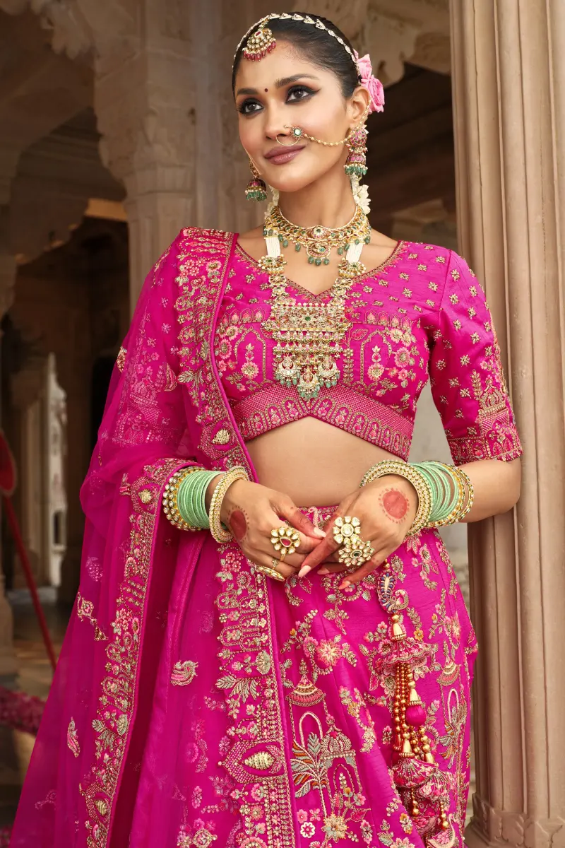Gorgeous hot pink/rani colour bridal lehenga with heavy hand embroidery, khatli work, sequins, beads/katdana work, stone, thread and zari work.