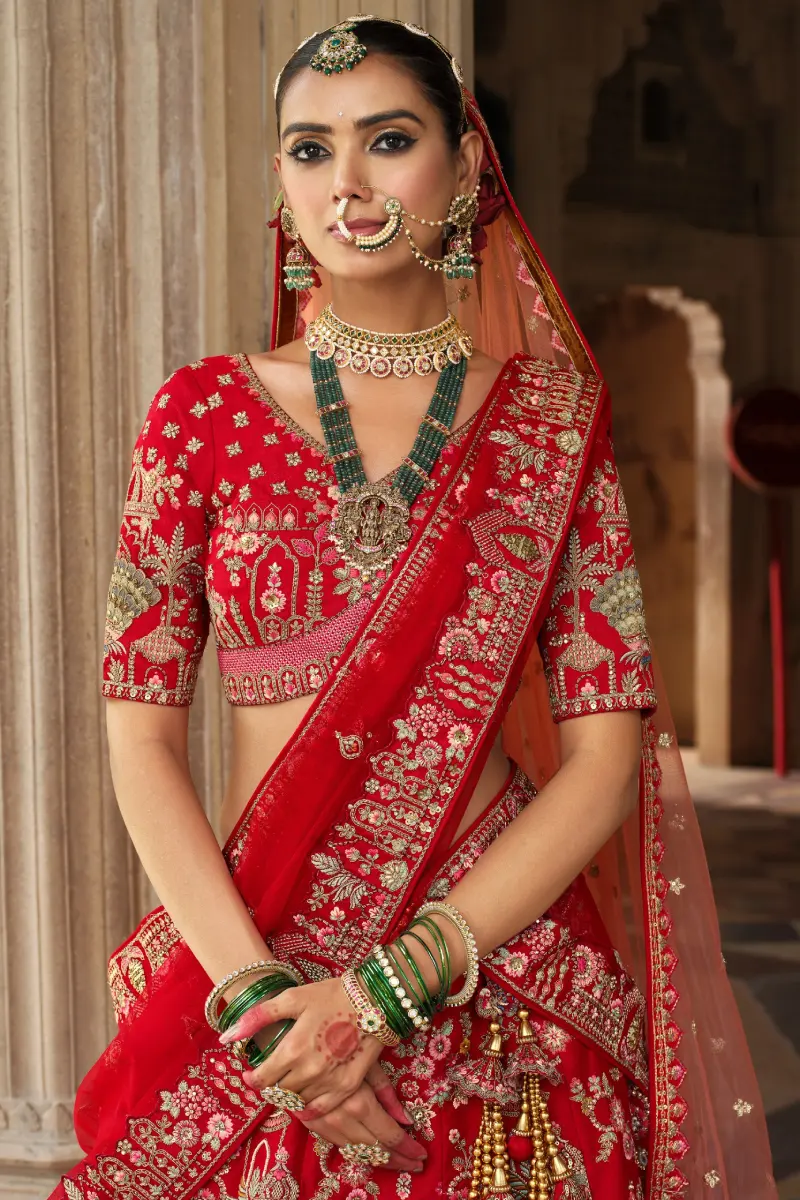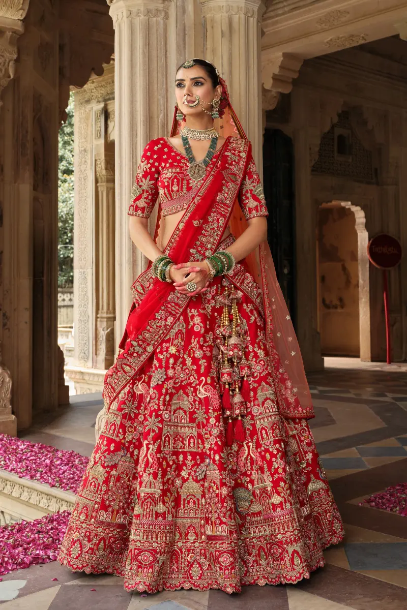 Gorgeous red bridal lehenga with heavy hand embroidery, khatli work, sequins, beads/katdana work, stone, thread and zari work.