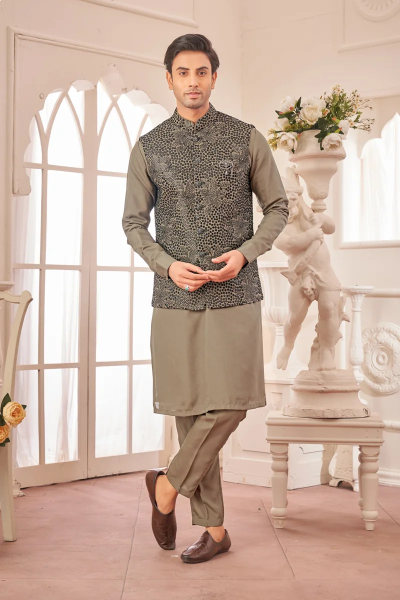 Art silk Embroidered panjabi/kurta payjama with sequence and embroidered coti/jacket which embellished with decorative buttons