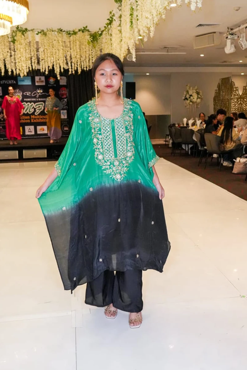 Luxurious silk on dual shades with hand karchupi work, detailed with spring, stones, beads and glass embellishments, perfect for weddings and special occasions.