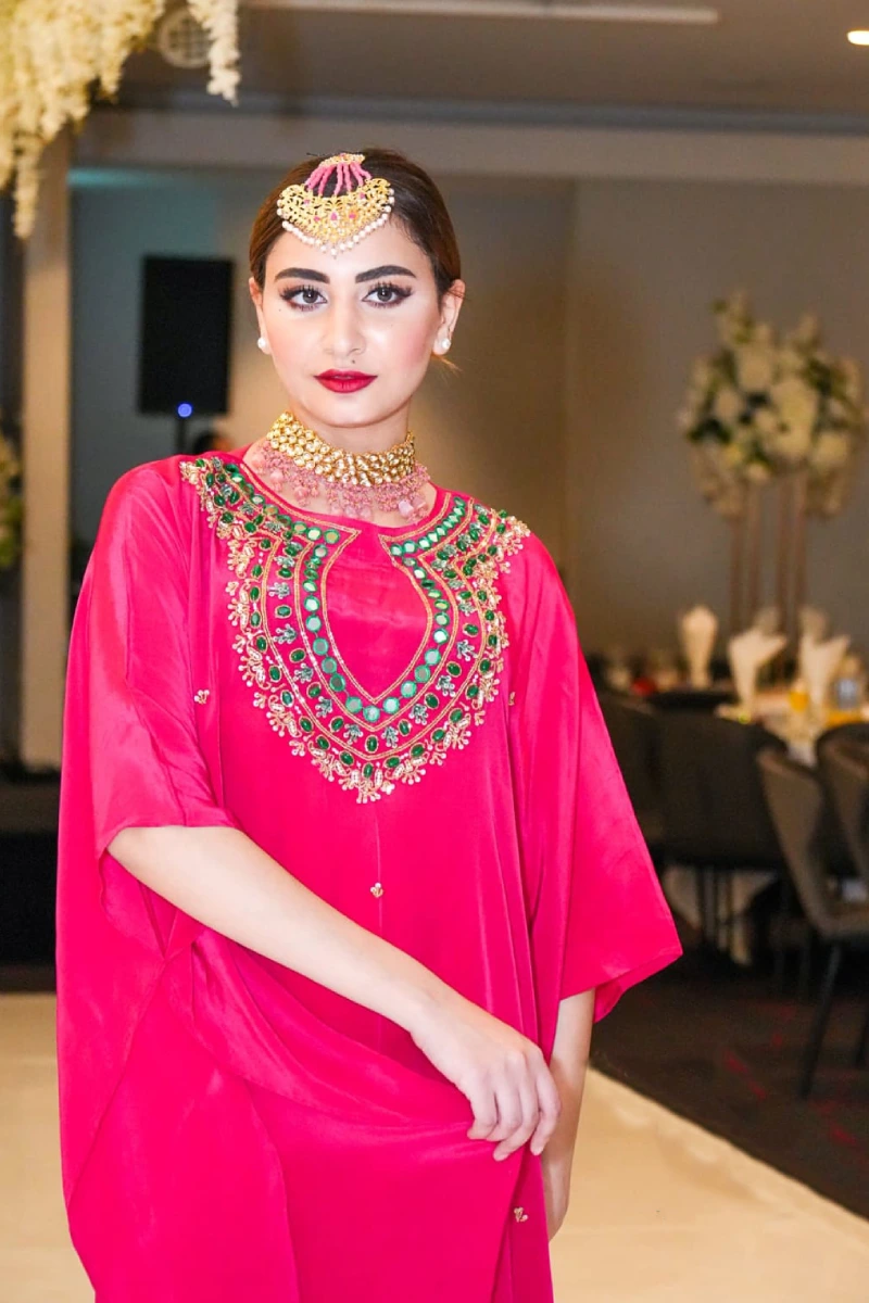 Luxurious silk with hand karchupi work, detailed with spring, stones, beads and glass embellishments, perfect for weddings and special occasions.