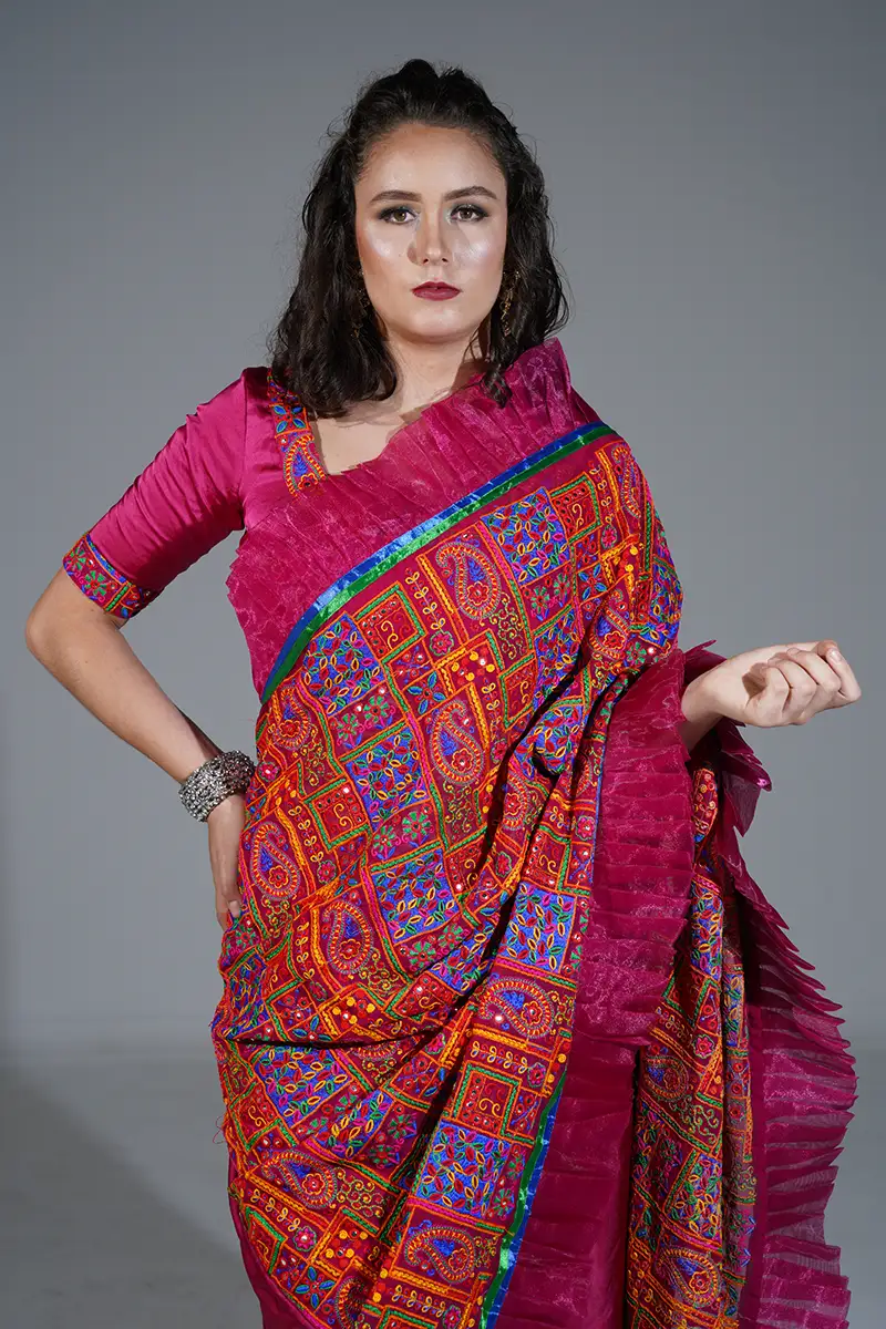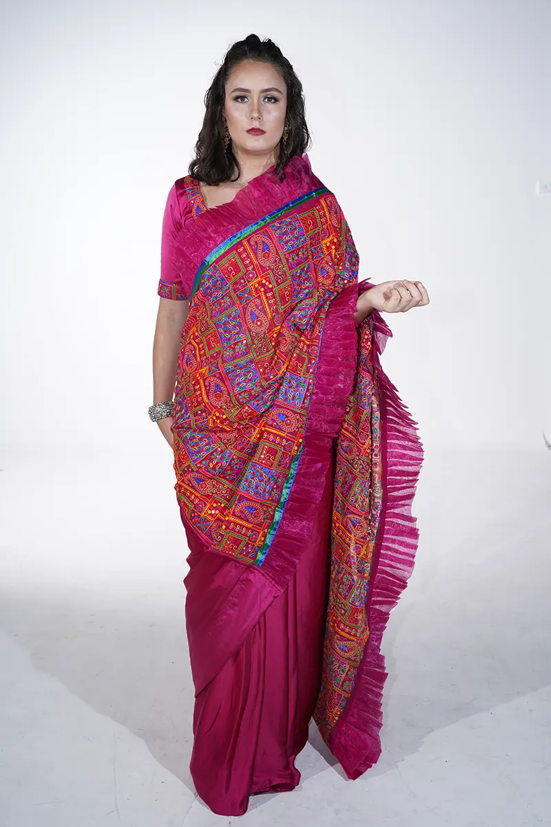 This graceful saree is crafted from pure soft georgette, offering a luxurious feel and fluid drape. It features an intricate handstitch design and adorned with ruffle that adds a modern yet timeless appeal.