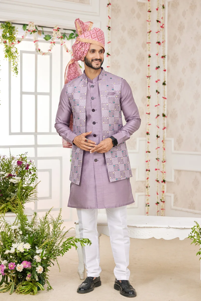 Light purple embroidered and sequence panjabi/kurta set with coti/jacket
