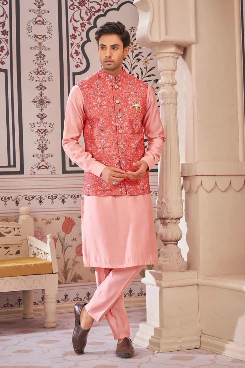 Light red art silk panjabi/kurta payjama with coti/jacket