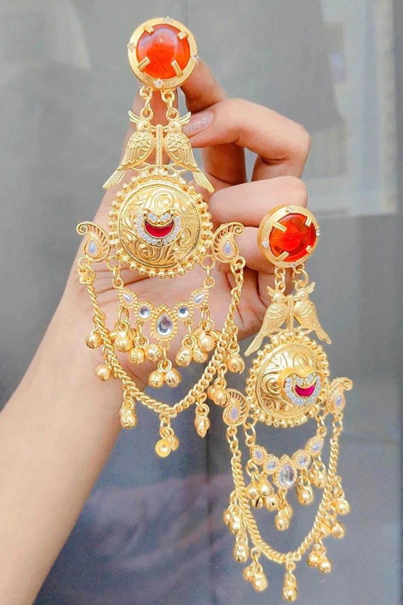 Beautiful golden long jhumka with hair hangings bahubali panchi kundan earrings