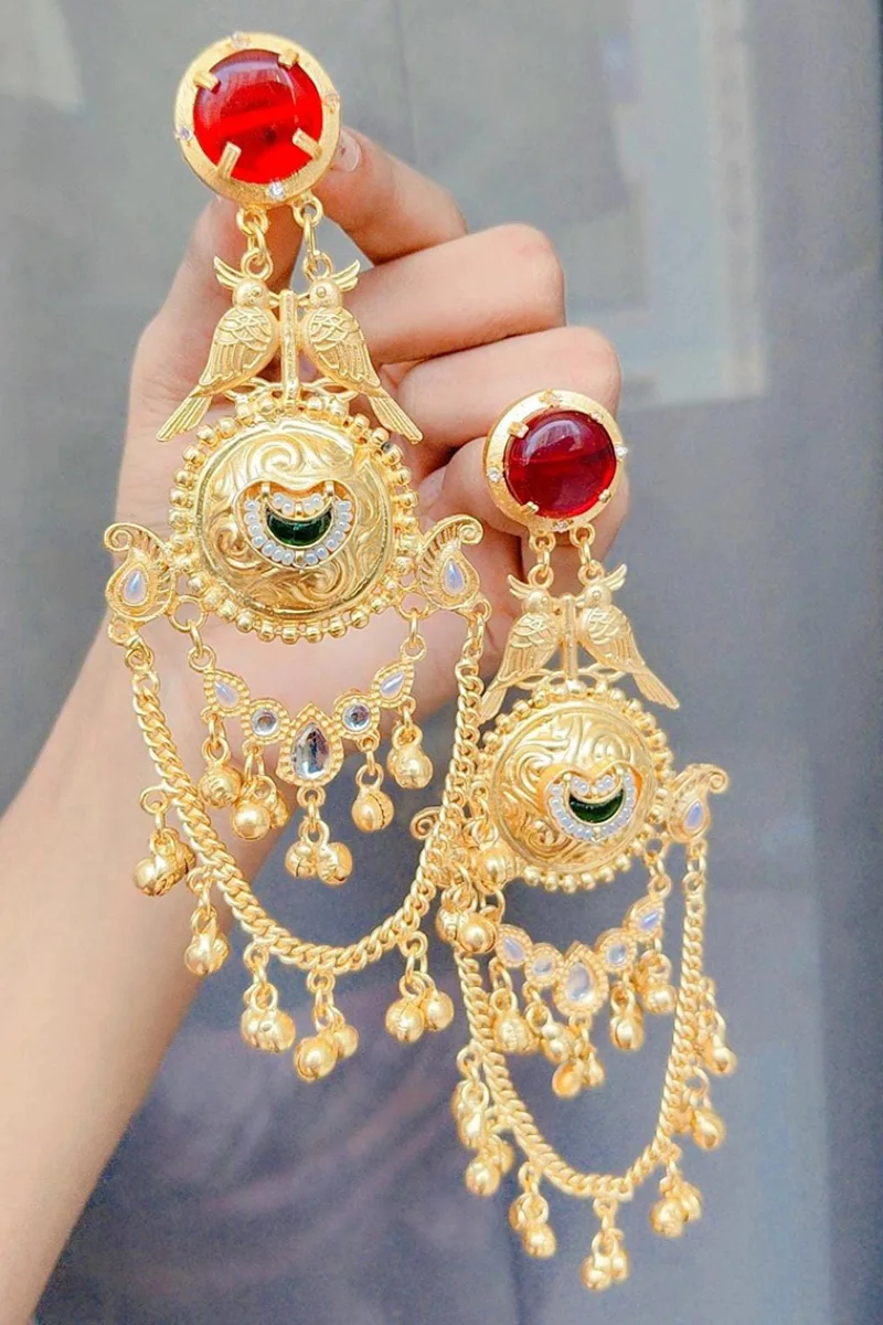 Beautiful golden long jhumka with hair hangings bahubali panchi kundan earrings