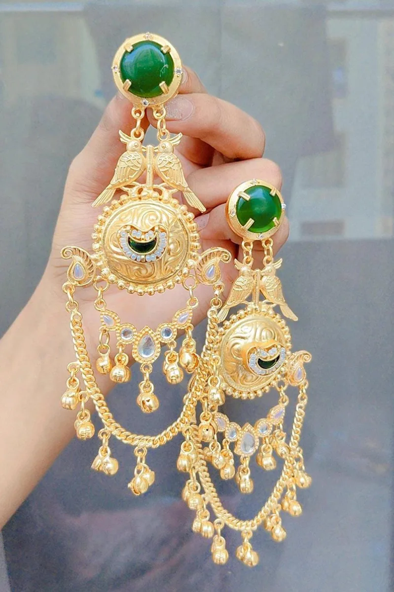 Beautiful golden long jhumka with hair hangings bahubali panchi kundan earrings