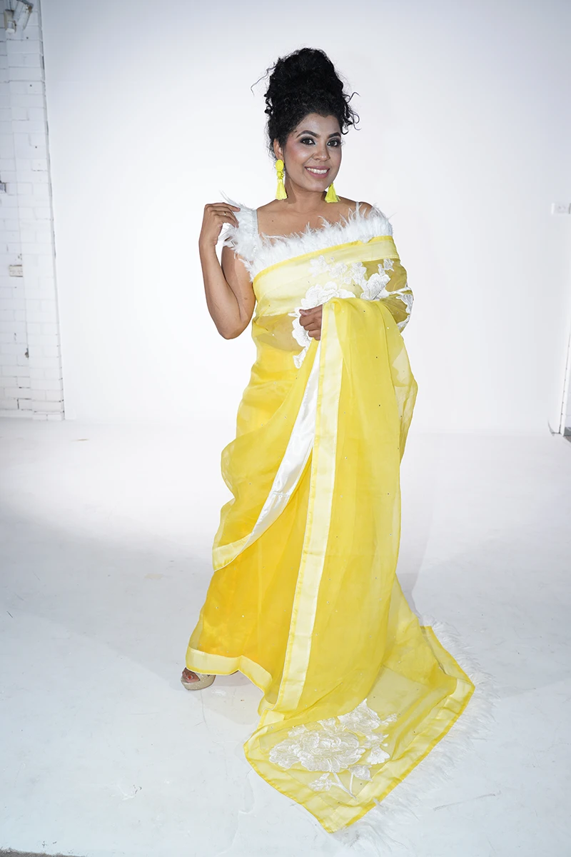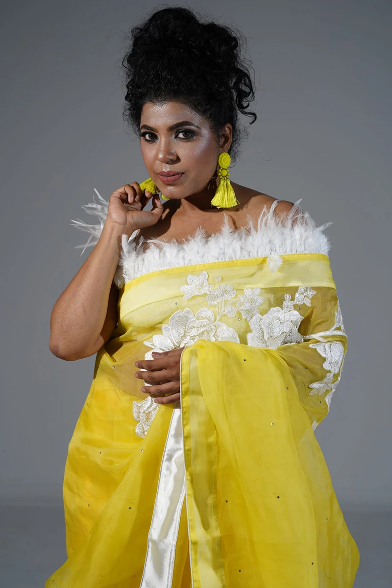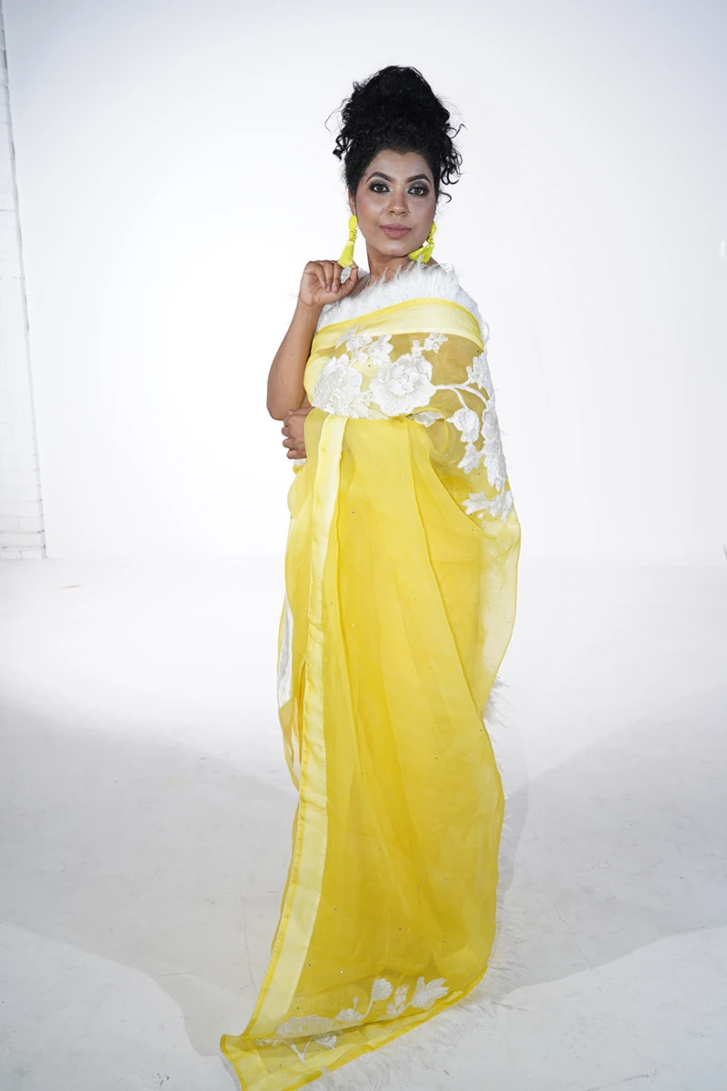 Bright yellow original sofura muslin saree, beautifully detailed with hand embroidery, cutwork, and delicate sequin embellishments. The addition of artistic bird motifs adds a unique and eye catching charm, making it a standout piece for any special occasion.