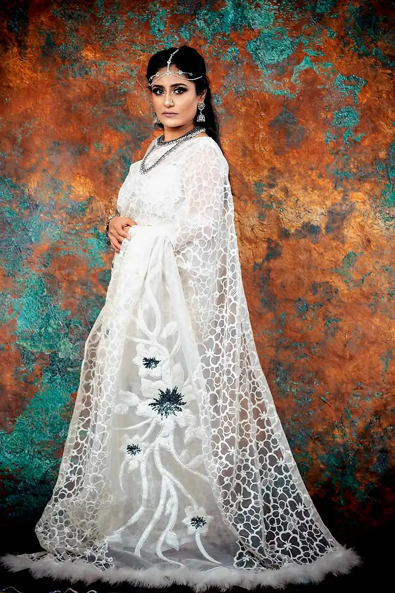 Original white sofura muslin saree, beautifully detailed with hand embroidery, cutwork, and delicate sequin embellishments. The addition of artistic bird motifs adds a unique and eye catching charm, making it a standout piece for any special occasion.
