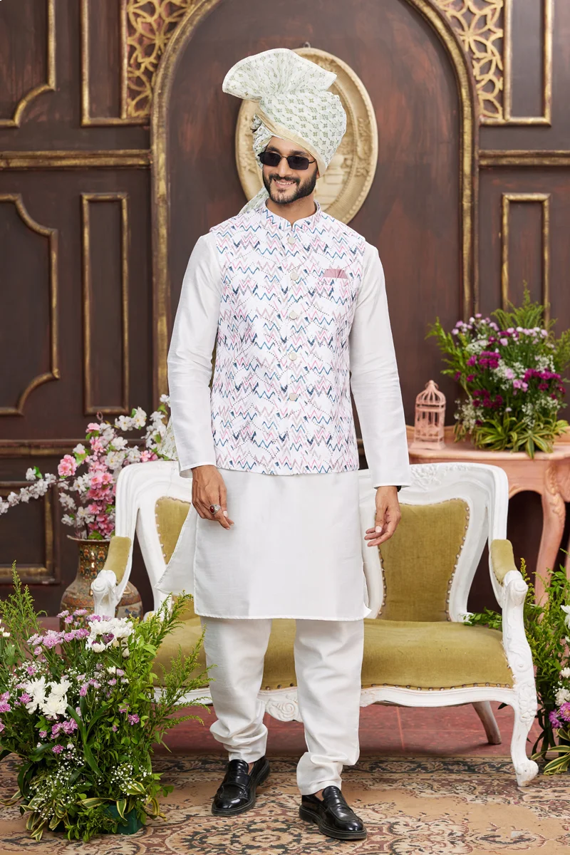 Off white embroidered panjabi/kurta set with coti/jacket