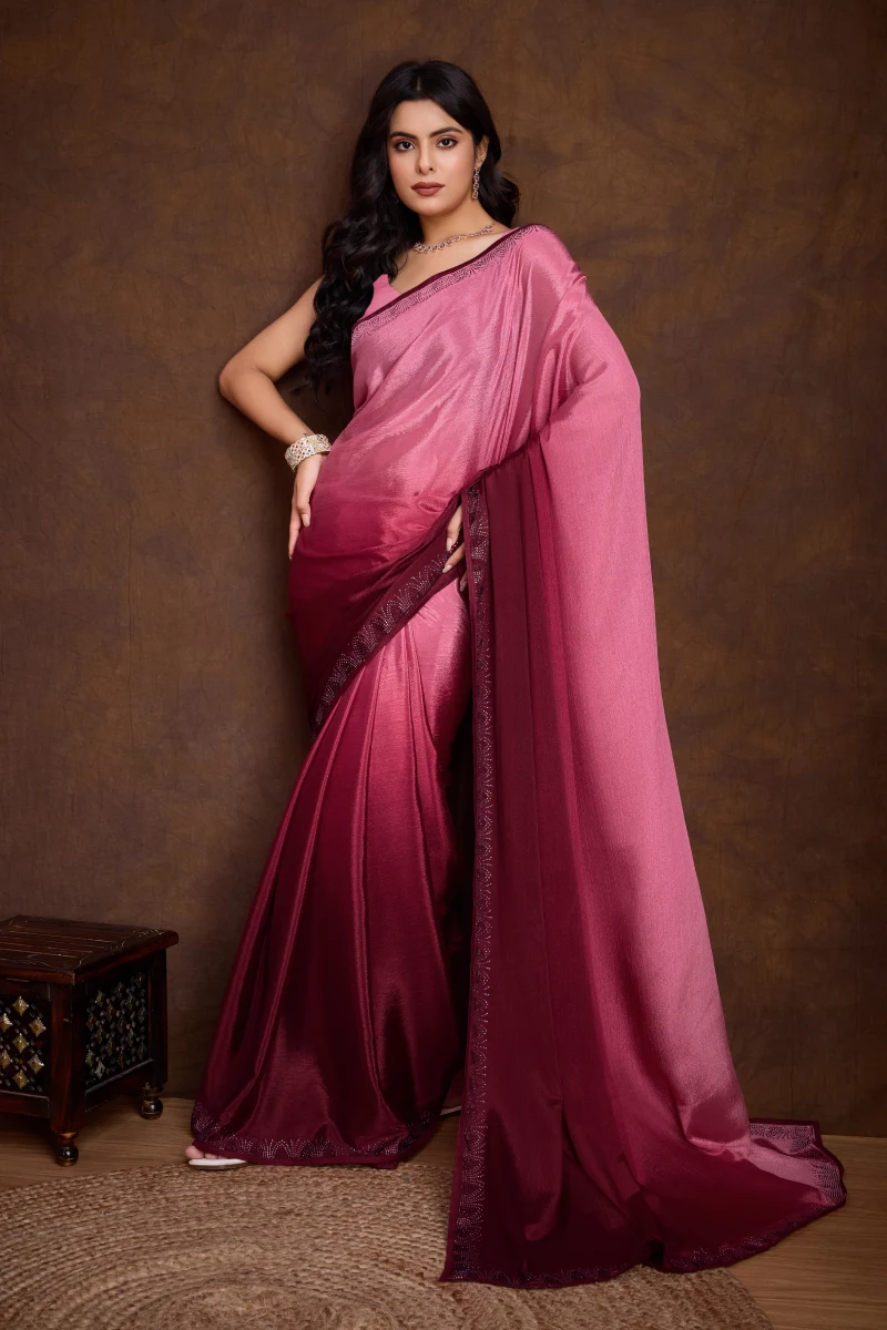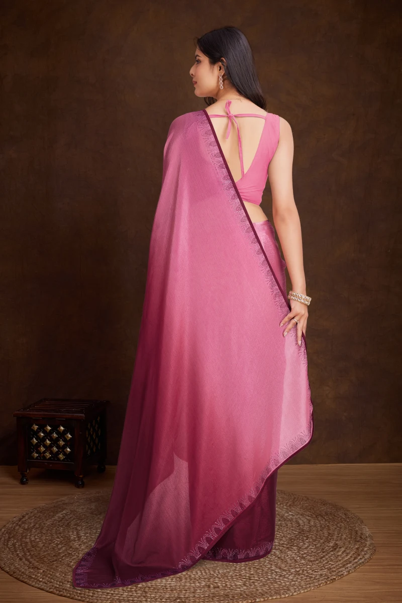 Discover our stunning saree collection, crafted from shaded chinnon fabric. Adorned with double-tone swarovski hot-fixing and elegant designs, each saree features subtle piping throughout. Paired with a blouse showcasing sleeve work in dual-tone swarovski for a lasting allure.
