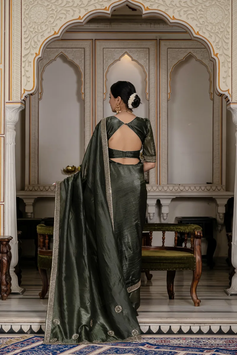 Green tissue gold crush saree with exquisite cutdana & zarkan hand embellishment