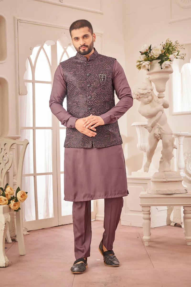 Classic wine art benarasi silk (mixed silk) panjabi/kurta with Aligadhi pant paired with gorgeous heavy embroidered & sequence work coti/jacket which embellished with decorative buttons and jacket pin